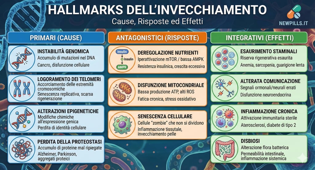 Per decenni, la biologia ha cercato di identificare le cause radice dell'invecchiamento. La svolta è arrivata con la codificazione dei "Hallmarks of Aging" (segni distintivi dell'invecchiamento), un quadro concettuale che definisce i processi biochimici che guidano il deterioramento. Originariamente nove, una revisione fondamentale pubblicata su riviste come Cell e Nature Aging nel 2023 ha espanso questo elenco a dodici segni interconnessi, offrendo una visione sistemica della senescenza.