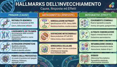 Questi dodici processi non agiscono isolatamente, ma seguono una gerarchia causale che si muove dai danni molecolari primari verso risposte cellulari disfunzionali, culminando nel fallimento funzionale dei tessuti.
